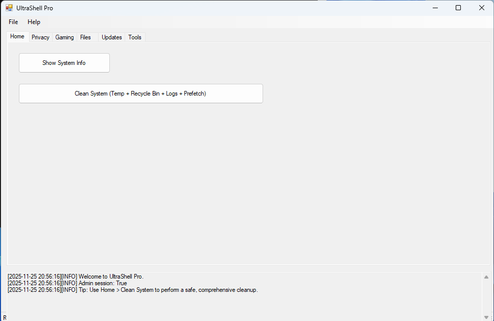 - System Info — Quick overview of OS, CPU, RAM and current user privilege status.