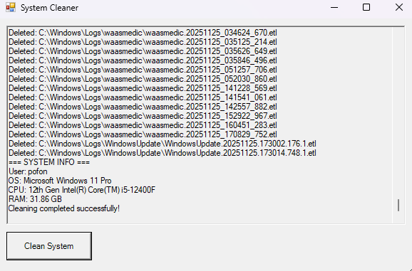 - System Cleanup — Fast, safe removal of TEMP folders, Prefetch files, Windows logs and Recycle Bin.