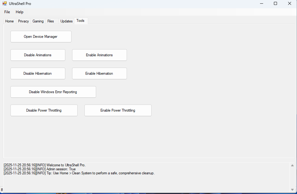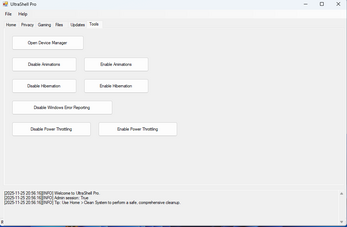 - Performance Optimization — Activate Ultimate Performance power plan and manage power throttling for better responsiveness.